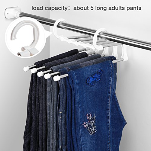 -. Feature : 【Keep pants crease-free, Make all pants compact & orderly and pick them with ease】: design with 5 retractable hanging rods, each rod for one piece pant. / 【Tidy and save space in your closet】: hanging up 2 hooks let the hanger to be horizontal, that make all pants, jeans, scarf, ties etc compact and organized. dropping down 1 of the hook let the hanger to be vertical, that save space in your closet. / 【Retractable and rotating hanging rods】: very flexible operation when you hang up and take off clothes from the magic hanger. The hanging rods can be pull out and push back, also can rotate by almost 360 degree. It will protect the hanger not to be out of shape. / 【Durable material】 : made of stainless steel and ABS material, never get rust and be out of shape. / 【after-sales service】: we will resend you a new one if the hanger was broken in 6 months,just send us a picture proof.