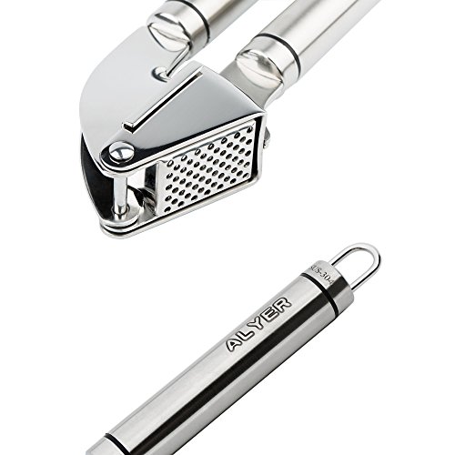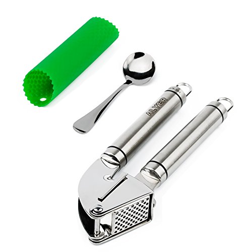 ALYER SUS304 Stainless Steel Garlic Press with Free Upgraded Silicone Garlic Peeler and Mirror Stainless Steel Scraping Spoon