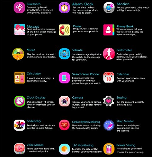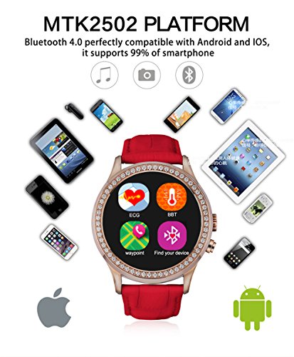 -. Feature : Fashionable Shiny Crystal Luxurious.MTK2502 Bluetooth 4.0 compatible with 99% of Android and iOS smartphones / Hand shake control:to view time or answer phone etc.6 clock styles, 3 changeable themes for options, support Android/IOS smartphone / Waterproof to save it from spills and accidental drops / Support Heart Rate Monitor to Track your health.high-definition Camera capture a quick moment / Passometer,Fitness Tracker,Sleep Tracker,Mood Tracker,UVA testing,Message