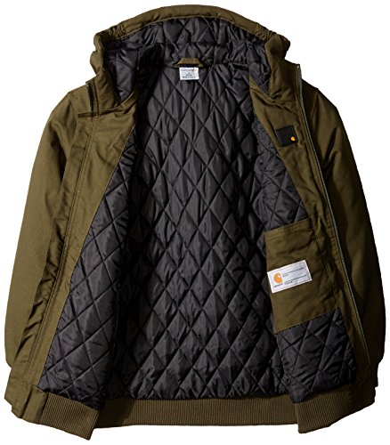 Extended zip through hood closure and internal storm flap to block out the cold. Triple-stitched main seams for added durability. Left chest zipper pocket with internal media port. 2x2 rib at front pockets, sleeve and bottom hem. Internal pocket for extra storage and inside name tag label. Quilted taffeta lining in the body and sleeves for warmth without the bulk. Carhartt woven brandmark label on pocket and quick duck heat transfer on sleeve.Feature