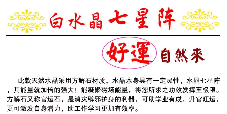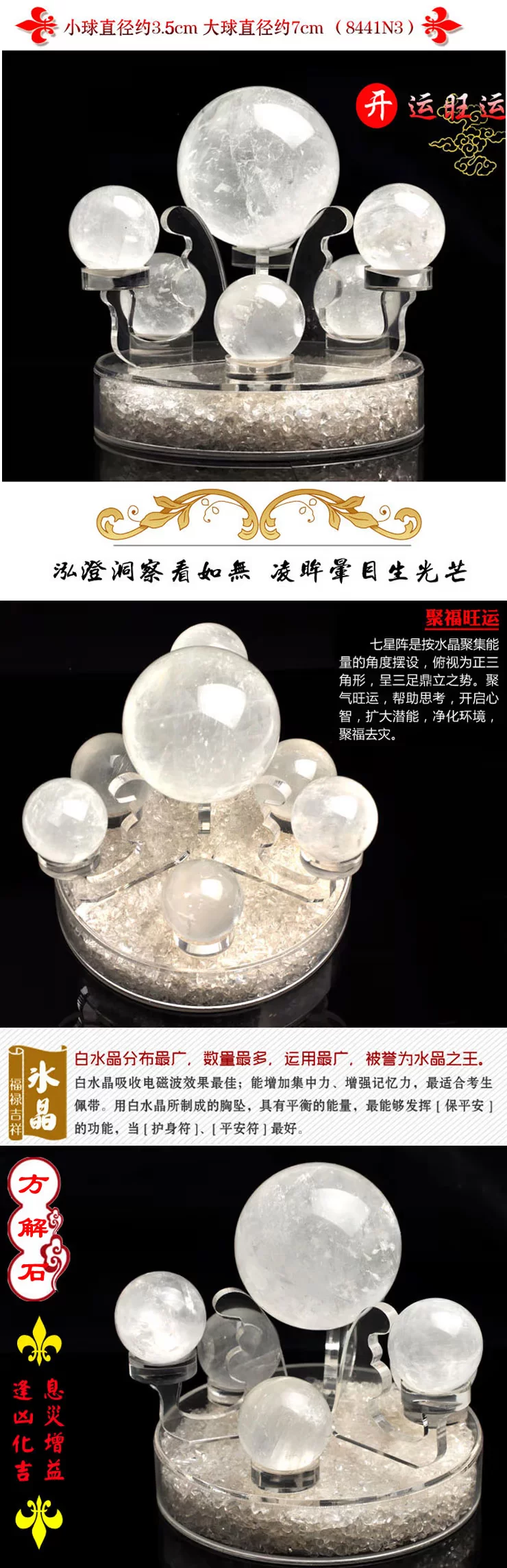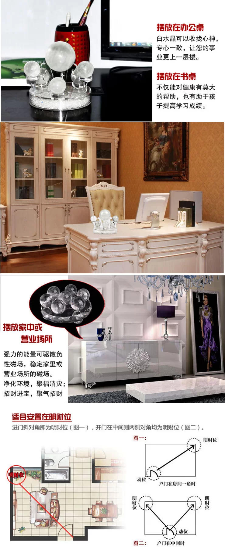 | 方解石在整个水晶的族群来说,分布广,数量多,运用广,一般来说,自然行成形状种类相当多,有普遍的块状、六角柱状、柱状群生的白晶簇、重叠成长形成的骨干等等。而大部分的都有包含冰裂、云雾等内涵物,完全通透的白水晶除非是小体积的(从大原矿直接切磨出来),大体积而又完全通透的白水晶价格较贵而且市面上假货比较多,尤其是白水晶球。 提供精神力量,对精神力及灵性的开发有莫大的帮助。有谓增加记忆力及集中力,其实是因为令精神、灵性的力量对抗了物质世界,因而有助思维的集中,不被外在的物象所蒙蔽。 【灵性作用】: (1).主健康,平衡个人身心及情绪,有助集中精神,对家人健康有莫大帮助。 (2).可放于书桌上,有助小朋友加强集中力和记忆力,从而提高学习成绩。 (3).吊坠,具有平衡的能量,当「护身符」、「平安符」好。 (4).将簇放在财位方,能使得气机旺盛,有助于生财、发财。 (5).将簇放在主管右后方,有助于建立威信,属下对其命令的贯彻执行,不敢拖延、敷衍。 (6).对于室内外的冲煞,可以在相对的地方摆上水晶球或是水晶柱,可以有效化解冲煞。 (7).在书台、办公台上,按照「左圆右方」或「前圆后方」的摆放原则,摆放水晶球和晶柱,一方面可以防小人骚扰,另一方面亦可使自己处世更加圆融。 (8).利用白水晶柱来摆设七星阵,可以作各种观想,效果宏大。 【主要功能】:镇宅、辟邪、去除病气、供佛灵修、百福千祥。 七星阵的基础是三角星阵法,由宇宙能量的符号,两组等边三角形,以相反方向交叠在一起,形成六角星。对犹太民族具有极深的宗教意义,也被称为大卫之星或所罗门之玺,是人类灵性与宇宙结合的象征。以此图形为基准,在六个角和中心点摆上晶株或水晶球,叫七星阵。由两组三角形成的大卫星,下层的三角代表肉体,人的生命活力,和下三轮(太阳,海底,脐轮),上层三角象征精神,人的灵性,和上三轮(喉,眉,顶轮),两个三角交叠,是心轮所在。七星阵每个三角形边长是7的倍数,中间的晶球是主干,体积比周围六颗小球的要大。七颗球是同一种水晶,效果好。 七星阵按水晶聚集能量的角度摆设,水晶球各自发出自己的磁场能量,使各个晶球的能量产生高频共振,聚集能量,七星盘则将这些磁场连接,成为气场,和宇宙能量结合。适合摆在家里或营业场所,强力的能量可驱散负性磁场,并调和,稳定家里或营业场所的磁场。净化四周负能量,帮助思考,开启心智,扩大潜能。改变人体及周围磁场,净化环境,聚福去灾。从灵修讲,可用冥想,吸收灵性,释放负面感情。在记录信息的同时,也记录主人的感情 。 七星阵摆放时辰: 1.属鼠人---丑时(23-1点) 2.属牛人---子时(1-3点) 3.属虎人---亥时(21-23点) 4.属兔人---戌时(19-21点) 5.属龙人---酉时(17-19点) 6.属蛇人---申时(15-17点) 7.属马人---未时(13-15点) 8.属羊人---午时(11-13点) 9.属猴人---巳时(9-11点) 10.属鸡人---辰时(7-9点) 11.属狗人---卯时(5-7点) 12.属猪人---寅时(3-5点) 七星阵摆放方位:(人站立房子正中央,以指北针定出正北方,去认定方位) 1.属鼠人:正北方 2.属牛人:北方偏东15度 3.属虎人:东方偏北15度 4.属兔人:正东方 5.属龙人:东方偏南15度 6.属蛇人:南方偏东15度 7.属马人:正南方 8.属羊人:南方偏西15度 9.属猴人:西方偏南15度 10.属鸡人:正西方 11.属狗人:西方偏北15度 12.属猪人:北方偏西15度 |