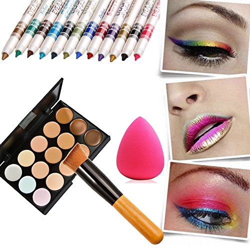 Feature : Cream concealers that offer terrific coverage on the dark circles, facial wrinkles and other facial defects and give you a new look. / High quality nylon material makes this brush comfortable and soft to use / With a cute waterdrop shape powder puff, soft, no irritation and helpful for creating perfect appearance (Color Random) / 12 different color eyeshadow pencil,can also be lipliner. / Package Includes: 1 x 15 Colors Concealer Palette; 1 x Oblique Head Contour Makeup Brush; 1 x Powder Puff; 1 x 12 Colors Eyeliners