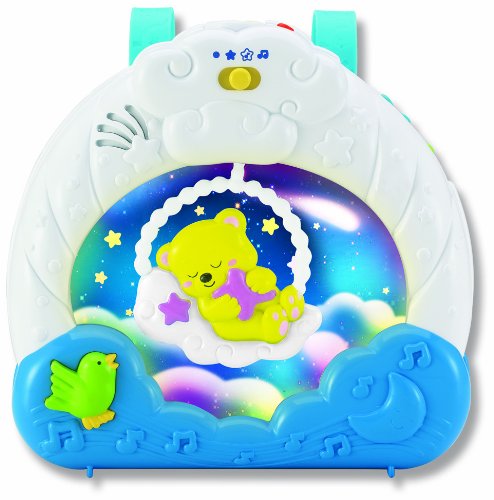 - Gentle, rocking bear crib light has soothing sounds and projection