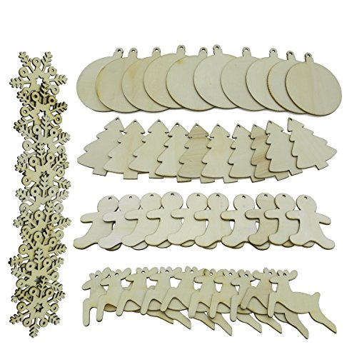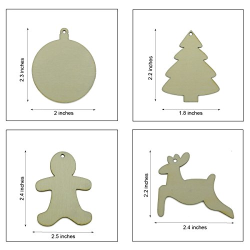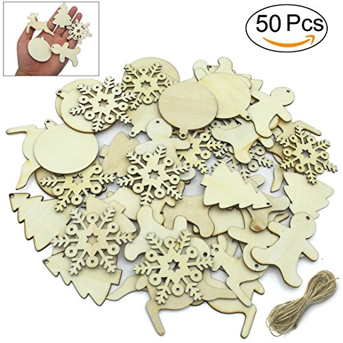 Cualfec 50 Christmas Ornaments Hanging Decoration Unfinished Wood Slices DIY Crafts for Kids 5 Different Designs Wood Snowflake, Gingerbread man, Christmas Tree, Reindeer and Round Wood Slices