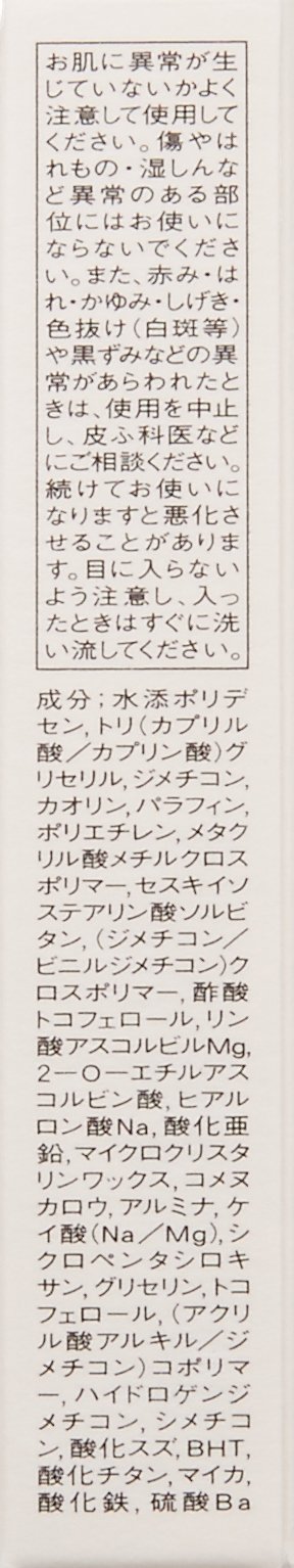 2-O-ethylascorbic acid, hyaluronic acid Na, zinc oxide, microcrystalline wax, rice bran, alumina, silicic acid (Na / Mg), cyclopentasiloxane, glycerin, tocopherol, (alkyl acrylate / dimethicone) copolymer, hydrogen dimethicone