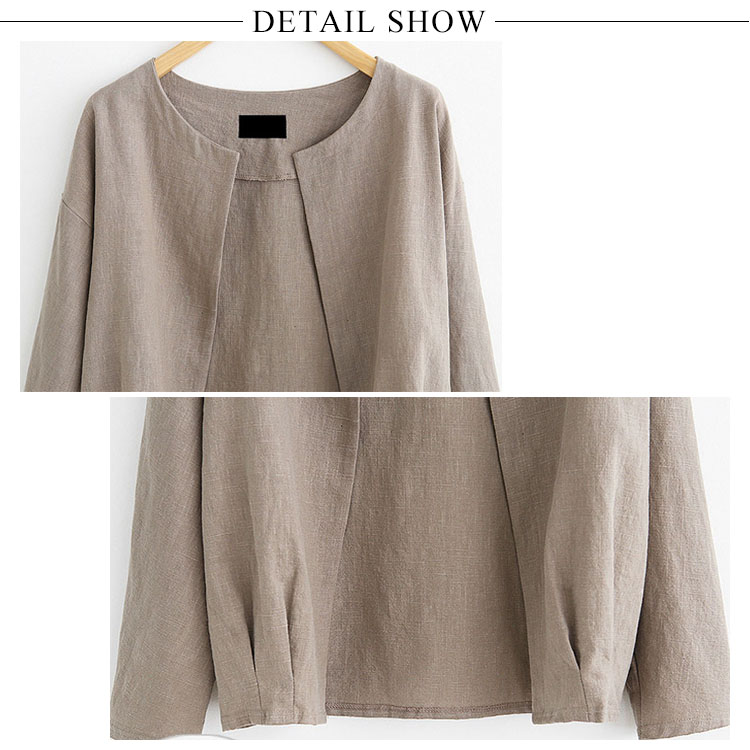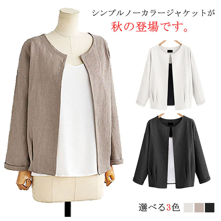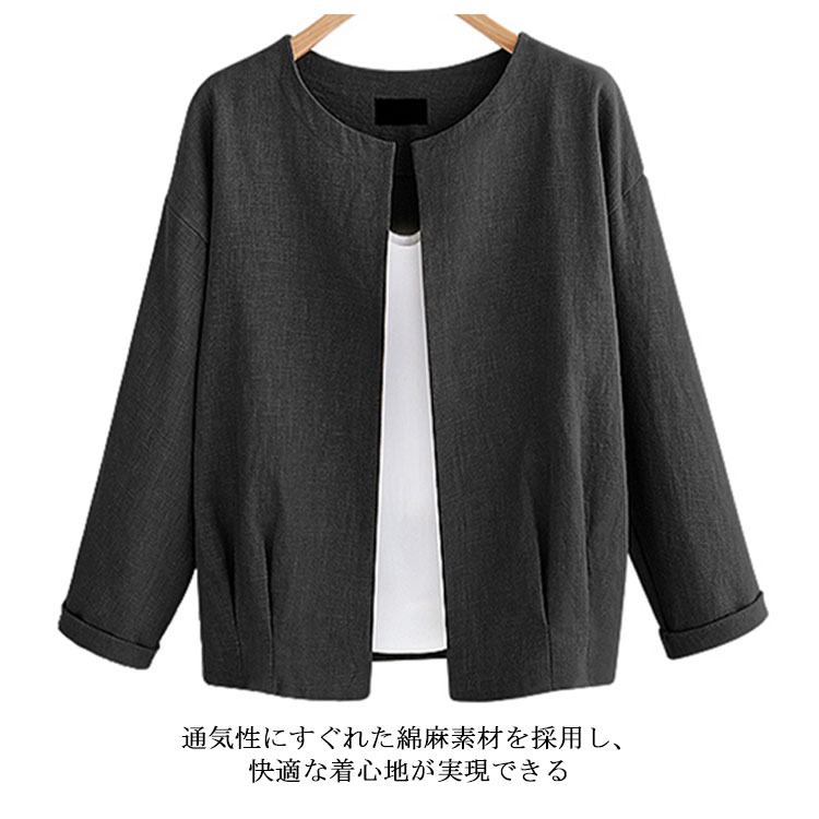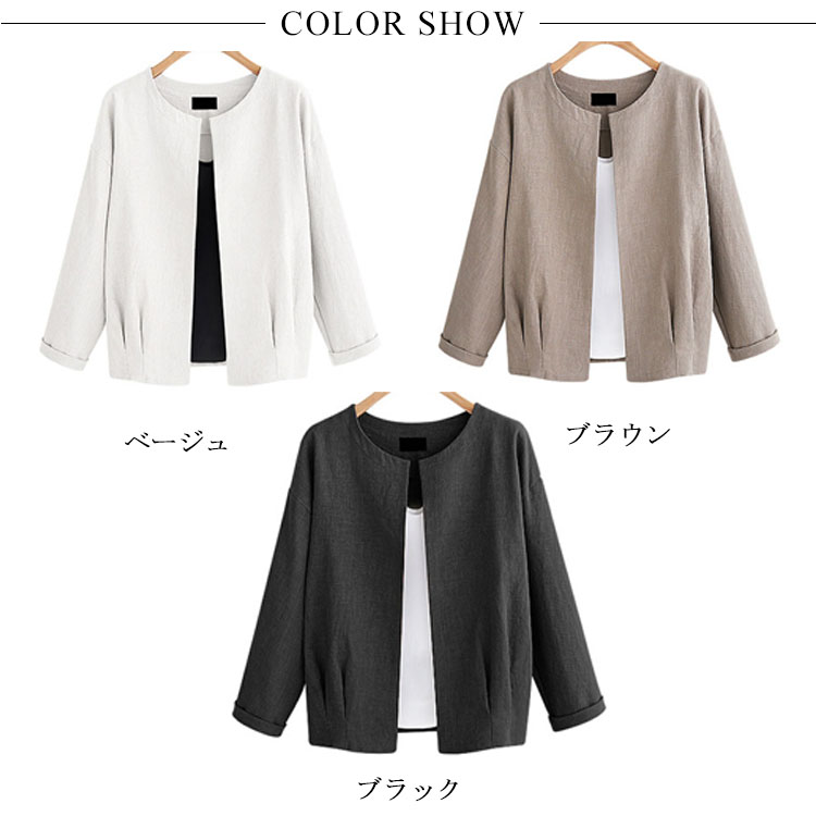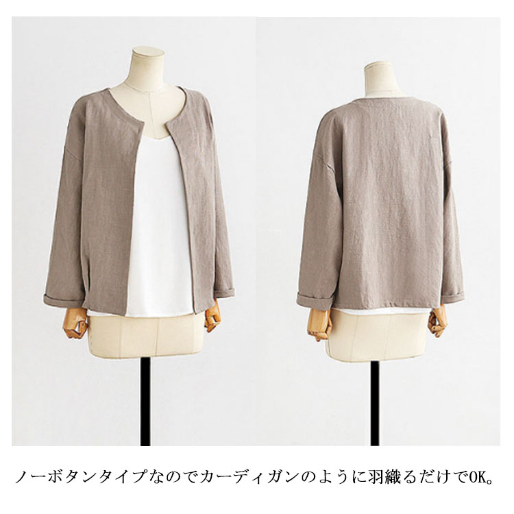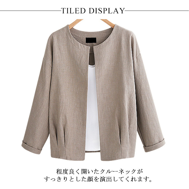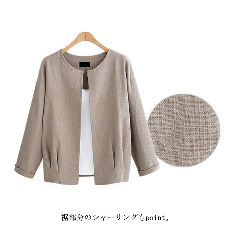 | シンプルノーカラージャケットが秋の登場です。程度良く開いたクルーネックがすっきりとした顔を演出してくれます。通気性にすぐれた綿麻素材を採用し、快適な着心地が実現できる。裾部分のシャーリングもpoint。ノーボタンタイプなのでカーディガンのように羽織るだけでOK。 | |