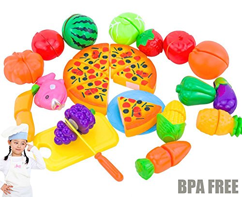-. Feature : 24pcs/set durable,nontoxic,PBA free plastic kitchen cutting fruit pretend play toys set for kids over 2-Year,definitely makes kid's safety under guaranteed; / Function:developing practical ability, hand-brain coordination capacity and satisfying their desire. It's also a suitable way to introduce the concepts of part, whole and fractions; / Wanna see a toddler enjoy countless hours of fun pretending to cook and cut up food like mom and dad do?these little fake fruit and vegetalbe play food sets are a delights to own; / Include 7pcs fruits (pineapple, apples, grapes, banana, strawberry, watermelon, orange)+ 7pcs vegetables(eggplant, carrot, corn, peppers, squash, tomato, cabbage)+ 6pcs pizza + 1pc fish + 1pc knife + 1pc plate + 1pc cutting board; / Great value for the fun, durable and kids don't burn out on playing with them as they have many uses to a kid with imagination;