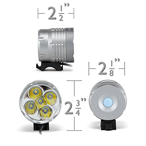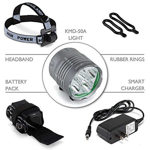 Studio : KMD SPORT Publisher : KMD SPORT Product Description Whether you're out expedition riding, on your daily commute, or blazing down that mountain trail, this KMD SPORT LED front bike light illuminates your path with the brightest beam in our entire range! Intensely Powerful Lighting Clearly see bumps, obstacles, and every corner with our 5600 lumen front bike light. The (5) XML-T6 LED bulbs produce the equivalent light output of a 25-piece CREE Q5 and remain impressively bright until the battery dies. Multiple Light Settings Easily switch between high, medium, and strobe settings using the smart switch designed by Third Gear- one of the premier manufacturers of aftermarket motorcycle parts. The bike headlight also comes with a power indicator light for easy monitoring of the charge level. Longer Lasting Battery No more running out of juice minutes after you set off. We've bundled our bike headlight with an extra-safe smart charger, and a rechargeable 5200mAh pack comprising of (4) 18650 batteries that powers the bike headlamp for 2-4 hours on high and up to 6 hours on medium. Mounting Made Easy The KMD SPORT bicycle headlight comes with 2 different-sized rubber fasteners to securely fasten the bicycle head light onto any handlebar, which can be quickly taken off for easy removal of the light. Aesthetics Meet Durability Sleek yet impressively tough, this rechargeable bicycle headlight brings on the durability without skimping on looks. It's rated IP65 waterproof, sports an aluminum alloy case hardy enough to handle any terrain, and features an eye-catching silver finish to complement your bike. Illuminate the way ahead with a bike head lamp kit that combines reliability, functionality, and quality to last for years. Click 'Add to Cart' now and receive a bonus hands-free headband! 0