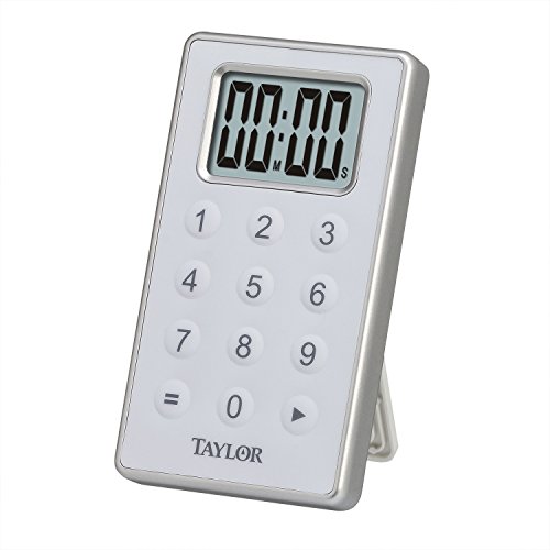 -. Binding : Kitchen -. Brand : Taylor -. Color : Silver -. EAN : 0077784024324 -. Feature : Smooth front surface is easy to clean and won't collect kitchen dirt / Sleek design with magnet and stand options / Program time quickly with numbered buttons / Counts up or down to 99 minutes, 59 seconds / Runs on 1 AAA battery, included -. Label : Taylor -. Manufacturer : Taylor -. Model : 5850 -. MPN : 5850 -. PackageQuantity : 1 -. PartNumber : 5850 -. ProductGroup : Kitchen -. ProductTypeName : KITCHEN -. Publisher : Taylor -. Studio : Taylor -. Title : Taylor Digital 10 Key Timer, Silver -. UPC : 077784024324