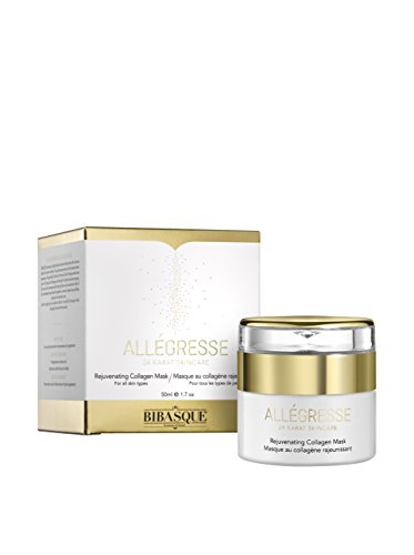 BIBASQUE ALLEGRESSE Rejuvenating Collagen Mask nourishes all facial zones while reducing visibility of lines and wrinkles. Pure gold boosts texture and rejuvenates skins appearance . Borage Seed Oil, Evening Primrose Oil and Pomegranate Extract are rich in Omega 3 and Omega 6 and help fight the look of premature aging . And natural oils and essences offer deep hydration and nourishment. Best of all, this remarkable mask is free from parabens, mineral oil, sodium lauryl sulfate, petroleum and synthetic color. Directions: Apply over dry facial skin. Wait for it to dry (8-10 minutes). Wash thoroughly. Follow with facial serum.Feature