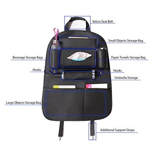 【Multi-Pocket Storage Bag】ZOTO car backseat organizer is perfect fit for organizing common travel accessories. 2 bottle pockets, 1 tissue box pocket, 1 umbrella pocket, 2 hanging hook, 1 pocket for small things ( like phone, pens, purse/wallet ect.), 2 large pockets for iPads, books, office files/documents and more.With the Back Seat Travel Bag you can keep everything organized in one place and, thus, have more space for the passengers.