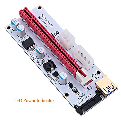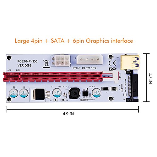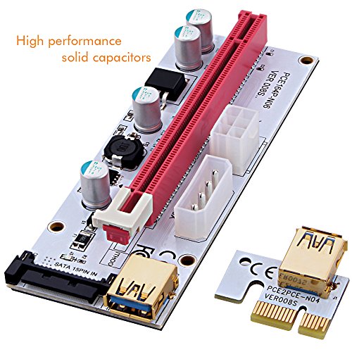 Studio : ZIJIEZ Publisher : ZIJIEZ Binding : Electronics Product Description Features: - 4 High Quality Solid Capacitors on each card for reliable and safe power delivery - 4pin, SATA and Graphic card 6pin interface are optional to power, which provides Graphic card independent power and reduces motherboard burden when using more graphic cards. - 60cm USB 3.0 riser cable enabling flexibility in the placement of your PCI-E devices. - Gold plated contacts make a better connectivity and long lifespan. - 4 holes for attaching the riser card to your rig. - Plug and play, no driver needed. - Supports 1x,4x,8x,16x PCI-E slot of the motherboard.