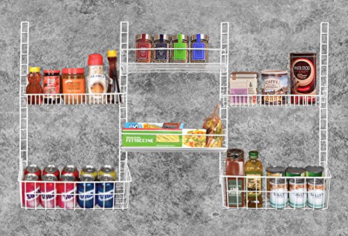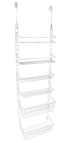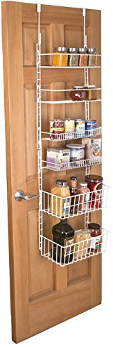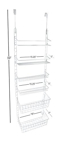 The 6 Tier Deluxe Over-The-Door Pantry Organizer is quick and easy to setup. Hangs over the door with the sturdy included hooks or easily mounts to the wall. New and improved interlocking shelves provide durability and maximum storage for many different household items. Adjustable basket shelving allows you to customize which items are stored where in any room in your home. The sturdy design and the rustproof finish make this a great multi-use storage solution.Feature