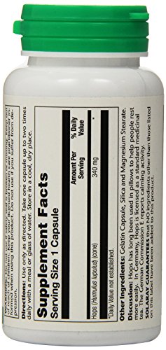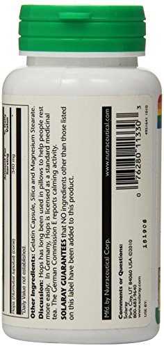 -. Binding : Health and Beauty -. Brand : Solaray -. EAN : 0076280113303 -. Feature : Promotes relaxation for restful sleep / Has calming properties that help clear the mind and relax the entire body / Can help you get more sleep without the harsh side effects of traditional sleep aids -. IsAdultProduct : 0 -. Label : Solaray -. LegalDisclaimer : These statements have not been evaluated by the Food & Drug Administration. This products is not intended to diagnose, cure, mitigate, treat, or prevent any disease. -. Manufacturer : Solaray -. Model : 076280113303 -. MPN : 11330 -. NumberOfItems : 1 -. PackageQuantity : 1 -. PartNumber : 11330 -. ProductGroup : Health and Beauty -. ProductTypeName : HEALTH_PERSONAL_CARE -. PublicationDate : 2014-10-11 -. Publisher : Solaray -. ReleaseDate : 2015-03-19 -. Size : 100 -. Studio : Solaray -. Title : Solaray Hops Capsules, 340 mg, 100 Count -. UPC : 076280113303