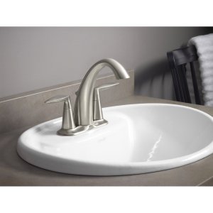 -. Feature : Two-handle centerset lavatory faucet for 4-inch centers / Features a high-arched spout for more space to work within the lavatory / Features composite yoke valve platform that includes nylon supply hoses for simplified installation / 1.5 gallons per minute maximum flow rate / KOHLER ceramic disc valves exceed industry longevity standards two times for a lifetime of durable performance