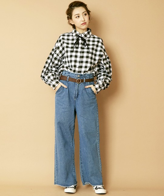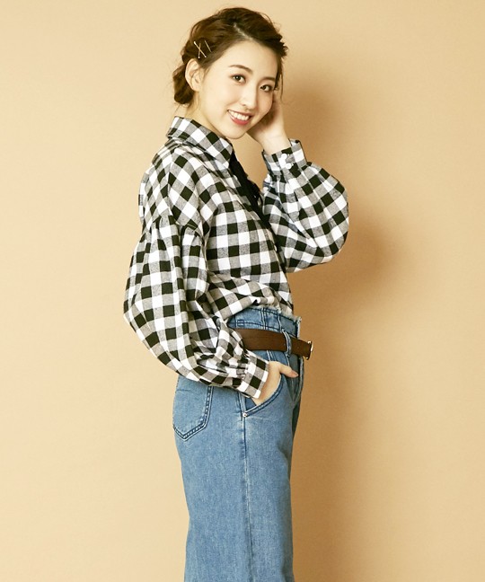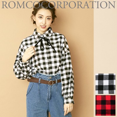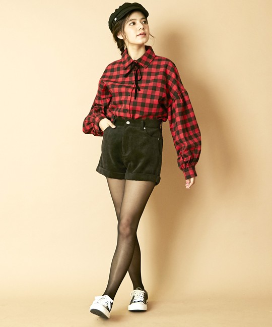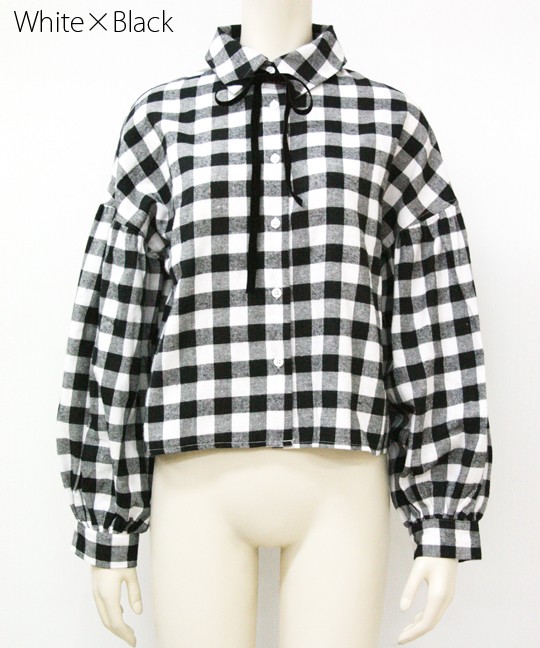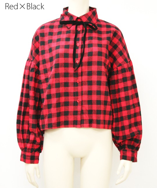 起毛ブロックチェックの短丈ブラウス♪ 今季トレンドのボリューム袖でオシャレ感UP☆ ベロアリボン付きで結んだりチョーカーみたいに首に巻いてもOK! ◆モデル 身長165cm