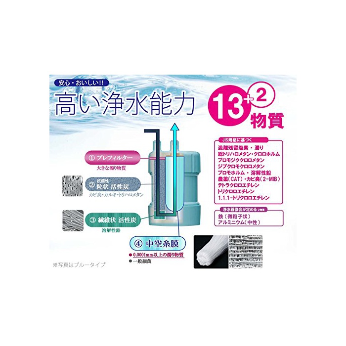 정수 능력:유리 잔류 염소/총여과 수량30,000L(제거율80%)고, 총새 할로 메탄/총여과 수량8,000L(제거율80%)고, Chloroform/총여과 수량8,000L(제거율80%)고, 브로《모지쿠로로메탄》/총여과 수량14,000L(제거율80%)고, 더 브로《모쿠로로메탄》/총여과 수량15,000L(제거율80%)고, 브로《모호루무》/총여과 수량19,000L(제거율80%)고, tetra 크로 러 에틸렌/총여과 수량17,000L(제거율80%)고, 새 크로 러 에틸렌/총여과 수량12,000L(제거율80%)고, 1,1,1-새 크로 러 에탄/총여과 수량9,000L(제거율80%)고, CAT(농약)/총여과 수량80,000L(제거율80%)고, 2-MIB(곰팡이취)/총여과 수량36,000L(제거율80%)고, 용해성연/총여과 수량8,000L(제거율80%)고, 더러움/총여과 수량30,000L(여과 유량50%)