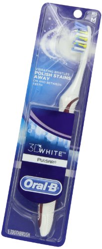 ReleaseDate : 2013-07-31 Studio : PG Publisher : PG Binding : Health and Beauty Product Description Battery-operated brushing for a brighter smile. Strike the perfect balance between a regular manual toothbrush and a power toothbrush when you brush daily with Oral-B 3D White Pulsar toothbrush. Battery operated, the 3D White Pulsar uses the vibration of the brush head to break up plaque and penetrate deeper between teeth than a regular manual toothbrush. Use it regularly to remove surface stains to reveal a whiter smile. Plus, the unique brush head design, featuring micro-pulsating bristles, actually contours to your teeth’s unique shape. Moderate pressure and gentle on tooth enamel, the 3D White Pulsar is an upgrade in your daily brushing routine. 0