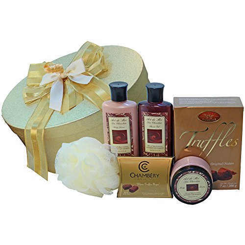 It's a chocolate fantasy come true, all in one elegant gift package. Exclusive Art de’ Moi Chocolate Truffle Spa products pamper them in luscious fragrance from head to toe, while taste buds delight in melt-in-your-mouth Belgian Chocolate Truffles. Now that's chocolate bliss! This gift is beautifully presented in a golden gift box with lid that makes handy storage or décor. Each basket is hand crafted with attention to detail, shrink wrapped and tied with a bow for presentation, ready for gift giving. Add a personalized message with your order by selecting gift at check out. Ice Packaging Option includes insulated packaging, ice packs, and special attention necessary to prevent melting when temperatures are over 75 degrees (typically May-Sept).