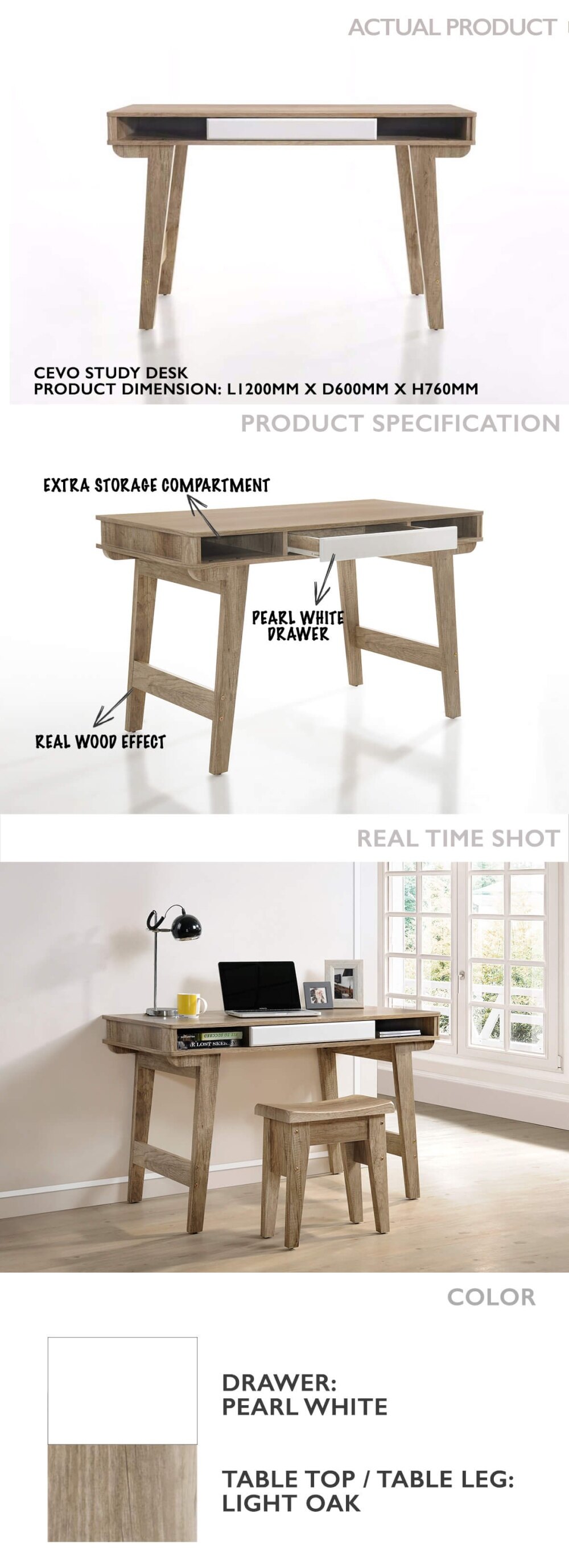 Designed exclusively by our lead designer, this computer desk is made cleverly to give you a stress-free work/study space, by combining both white and light oak colour which give out a calm and relax sensation. It provides you extensive drawer storage, and shelf for storage. Simply a must have for your home!