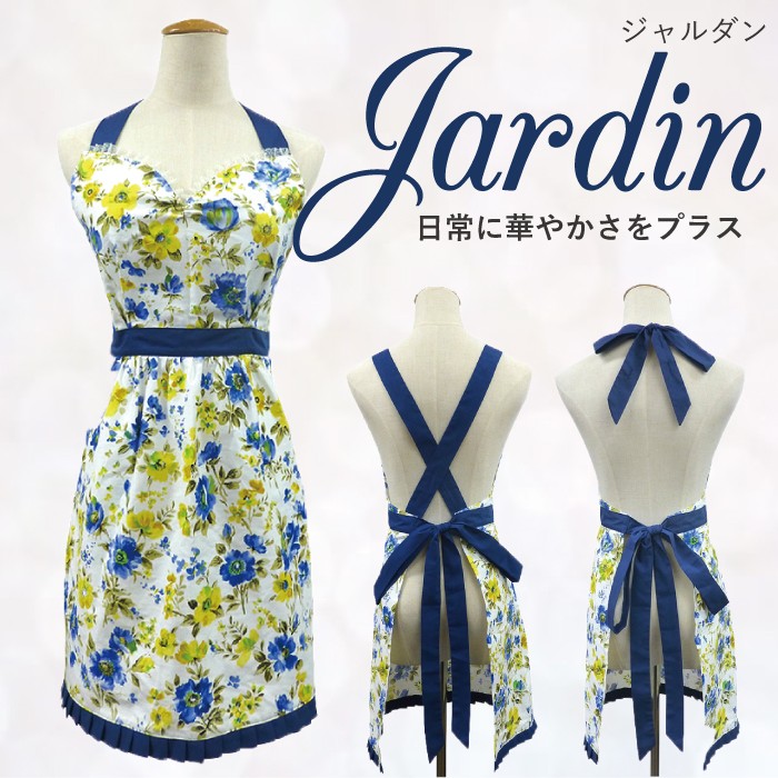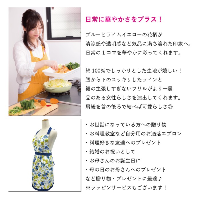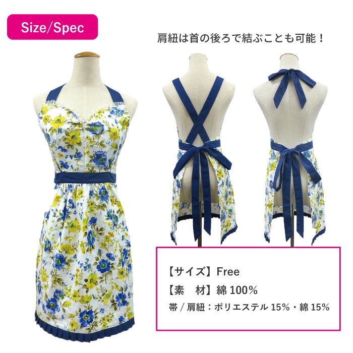 透明感、清涼感、気品に満ち溢れた 日常に華やかさをプラスしてくれるおしゃれで可愛いドレスエプロンです ■サイズ フリー 着丈(胸元から裾まで) : 約64cm  ウエスト : 約62cm 腰紐(片側) : 約94cm ■材 質 綿100% 帯 肩紐 : ポリエステル85% 綿15%