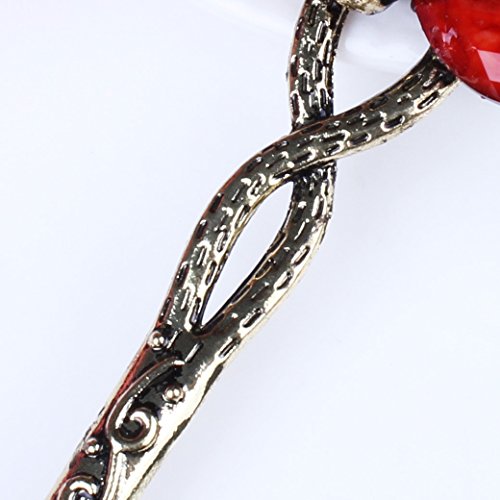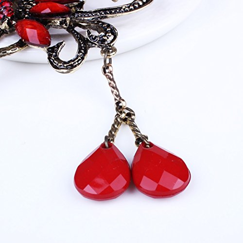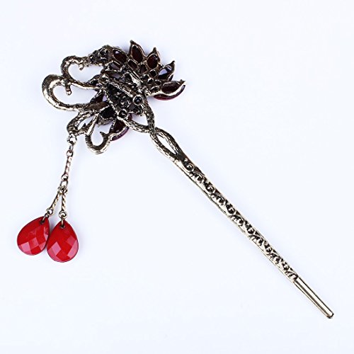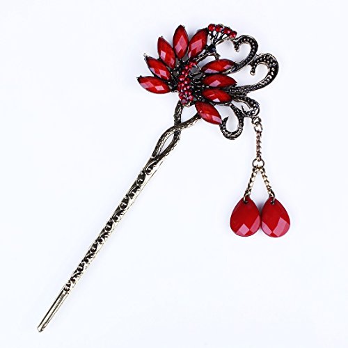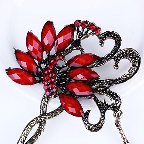 Qiyun ancient Chinese women's peacock bird flower lucky totem red rhinestone crystal bead antique brass hair pin...