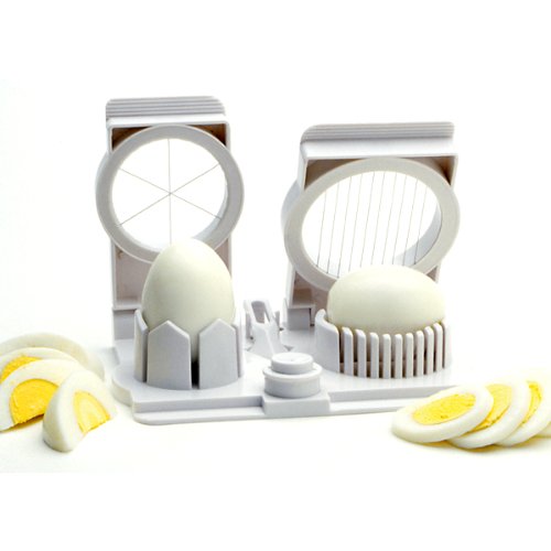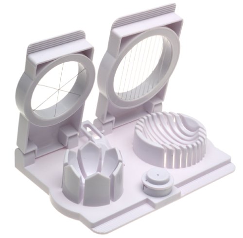Amazon.com This four-in-one tool slices eggs or mushrooms on the right side, turns them into moon-shaped wedges on the left side, pierces the end of eggshells with a sharp little needle, and comes with a handy garnishing tool for creating your own edible masterpiece. To prevent accidents, the egg piercer can be locked in the off position, keeping the sharp needle below the surface. To use the garnishing tool, just put the egg in the scalloped cup on the left side, slide the trowel-shaped tool into each of the six openings, then gently pull off the top of the egg for a "how'd you do that?" effect. The slicer's 10 stainless-steel wires give you uniformly sized pieces for better presentation. Both the slicer and the wedge tool have a lip on the top that protects your fingers while you're slicing. Dishwasher-safe, but hand washing is more effective. --Doree Armstrong 0