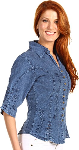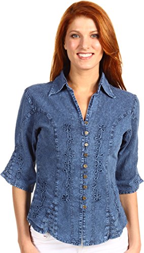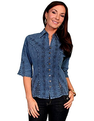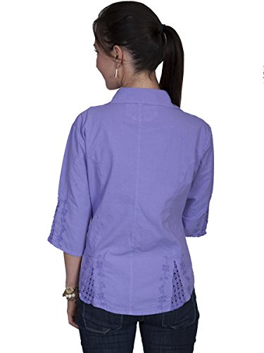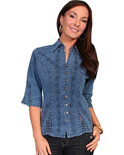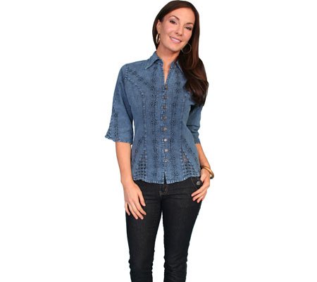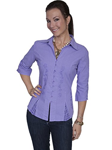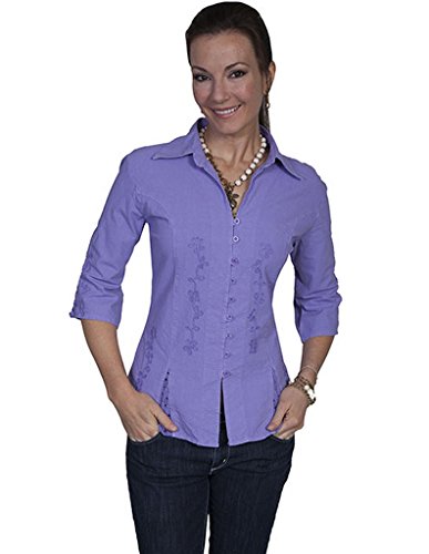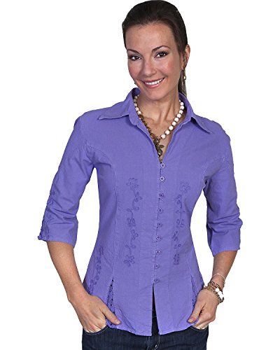 Product DescriptionCowgirls adore Scully clothing This 3/4 length sleeve top features an easy wearing spread collar. Made of 100% Peruvian cotton. Imported. S(2-4), M(6-8), L(10-12), XL(14-16), 2XL(18).0