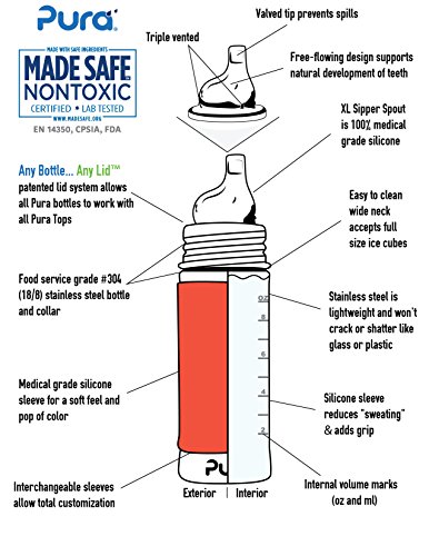 The Pura sippy cup features a food-grade #304 stainless steel bottle (18/8), and medical grade silicone components including XL Sipper Spout, travel cover, and sleeve. Like all bottles in the Pura Kiki collection, the Pura insulated sippy cup contains zero plastic parts! The included silicone sippy spout is a fast-flowing spout that helps your child transition from a bottle nipple. Ideal for children 6 months to 4 years, this sippy cup is compatible with all silicone components from Pura including our Natural Vent Nipples in various flow rates, Silicone Straw, and sealing disks. Each cup has pressed internal volume marks that can be clearly viewed on the inside of the bottle for easy measuring. The bottle is also compatible with nipples and spouts from other brands. With Pura you can rest assured that you are always using the safest and most eco-progressive bottle on the market. One Life...One Bottle