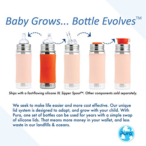 100% plastic free sippy cup easily transitions to infant bottle, straw bottle, sport bottle, or snack container with medical-grade silicone components from Pura. Baby grows. Bottle Evolves.