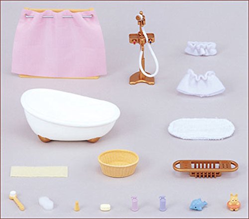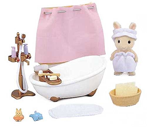 Stylish Bathroom set includes tub, curtain, towel, basket, bathmat, hairband, towel skirt, shower with hose, brush, sponge, soap, shampoo, rinse, toys etc.