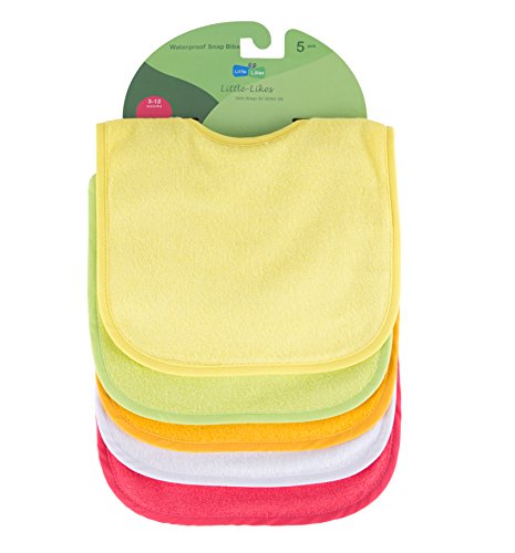 -. Binding : Baby Product -. Brand : Little-Likes -. Department : baby-boys -. Feature : WATERPROOF BIBS - Little-Likes baby bibs are waterproof with three layers. Super absorbent outer layer with waterproof middle layer keeps the baby safe from any mealtime accidents or drooling. The waterproof layer doesn't make any harsh noise when rubbed together. They are super soft with an inner waterproof coating. One of the best rated baby bibs on Amazon. / SNAP FASTNERS - Velcro bibs can be pulled easily by the babies. It can scratch the baby's skin which can hurt the babies and wreak havoc in your laundry. Little-Likes snap closures are quick and easy for you to use but too strong for your baby to pull off. Also, there are three different snap positions which are good for the growing babies from newborn to toddlers. / PERFECT FOR ALL DAY DROOLERS - These bibs are of a generous size that can protect the babies from making their clothes messy and also keep them dry and clean. It is BEST for protecting baby or toddler drools, especially babies with sensitive skin. / DIFFERENT COLORS - Five or Ten different colors that can be matched to the baby's outfit. / CLOTH TYPE - Made with 100% thick and soft terry cotton. Easy cleaning with machine wash and dry. -. Label : Little-Likes -. Manufacturer : Little-Likes -. ProductGroup : Baby Product -. ProductTypeName : BABY_PRODUCT -. Publisher : Little-Likes -. Studio : Little-Likes -. Title : Waterproof Baby Bibs with Three Snaps, Unisex