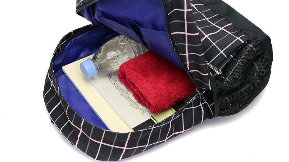 The main room which is easy to open and close with double zipper corresponds to A4 size. Inside is equipped with one pocket where A4 size clear file fits, two convenient pockets for storage of accessories such as lip and cream are equipped. The interior is decorated with a logo print on the blue color that catches the eye as soon as it opens.