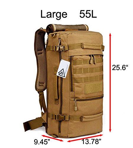 Feature : Size: 25.6"x13.78"x9.45", this is large size, with rain cover / Good for long range hiking,55-60L,offering multiple color for choice / Padded and adjustable shoulder straps straps for carrying comfort,breathable mesh backing provides a cool feel in hot weather, come with rain cover / Molle web for pouches, thickened computer protective interlayer inside and extra compartment / The hiking backpack can be carried by one shoulder or two shoulders, also can be used as handbag. It's concise designed for convenient and practical. The bag with large capacity is suitable for travelling,camping and other outdoor sports.