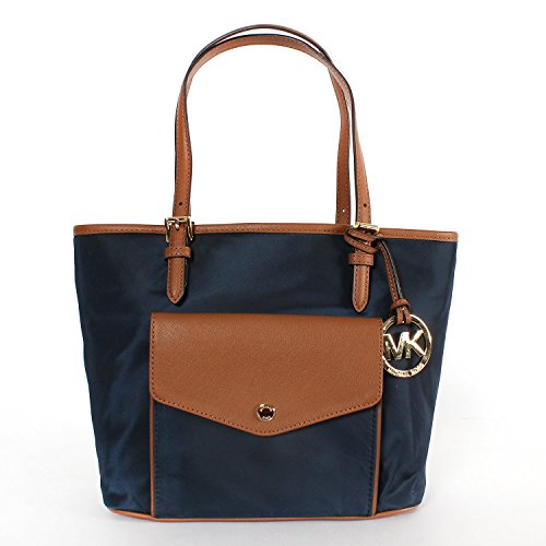 -. Brand : Michael Kors -. Color : Navy -. Department : womens -. EAN : 0889154938502 -. Feature : Nylon with leather trim and gold-tone hardware. / Front snap pocket. Four protective feet at bottom. / Interior features middle zip competment, 1 zip pocket, 3 open pockets, and 1 cell pocket. / Fabric lining. Double leather strap with 8" drop. / Approx. measurements: 13"L x 9"H x 5"D. -. ProductGroup : Shoes -. ProductTypeName : HANDBAG -. Size : MEDIUM -. Title : Michael Kors Jet Set Medium Pocket Multifunction Nylon Tote Navy -. UPC : 889154938502