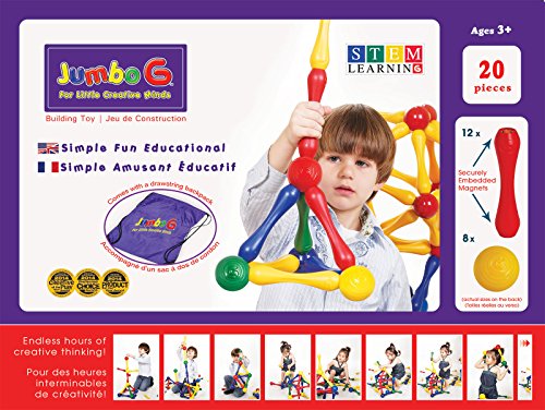 -. Binding : Toy -. Brand : Goobi -. EAN : 0850301001325 -. Feature : Awards: Kids Product of the Year | Creative Play of the Year | Preferred Choice Award / Jumbo G 20 piece set contains: 12 bars, made with high-quality ABS material along with strong attractions, 8 hallow balls, double coated in metallic paint, and a free drawstring bag for easy carrying and storing / Valuable kit for a STEM learning curriculum / Pieces are large and come in vibrant assorted colors - bars and hallow balls / Meets ASTM (USA) and EN71 (EU) toy safety standards | For ages 3 and up -. Label : Creative Zone -. Manufacturer : Creative Zone -. MPN : J-20 -. PackageQuantity : 20 -. PartNumber : J-20 -. ProductGroup : Toy -. ProductTypeName : TOYS_AND_GAMES -. Publisher : Creative Zone -. Studio : Creative Zone -. Title : Jumbo G Magnetic Building Toy - 20 Pieces -. UPC : 850301001325