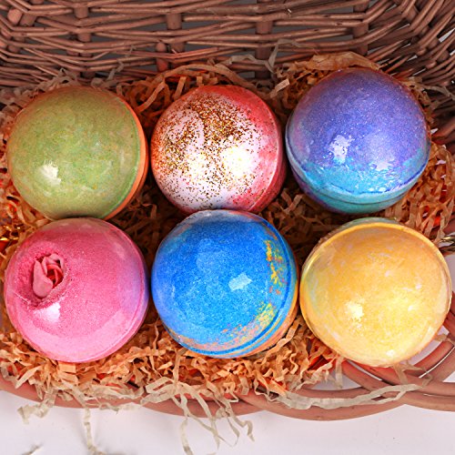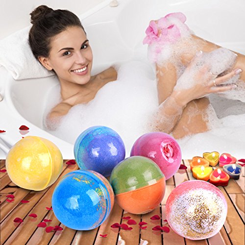 - [Healing and Relaxation in the Same Time] Turn bath time into spa time with our huge bath bombs and the extra 6 candles. You can relax and revitalize your body and mind. Get bath to nature with the addition of cocoa butter and essential oils, these bath bombs turn your tub water into a healthy soak that will help relieve aches and pains ,ease muscle discomfort and moisturizing your skin.