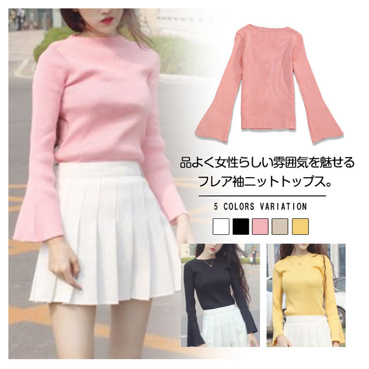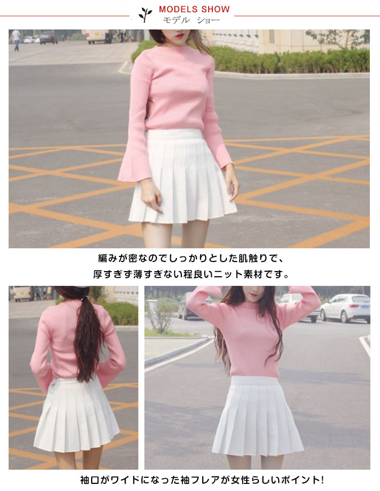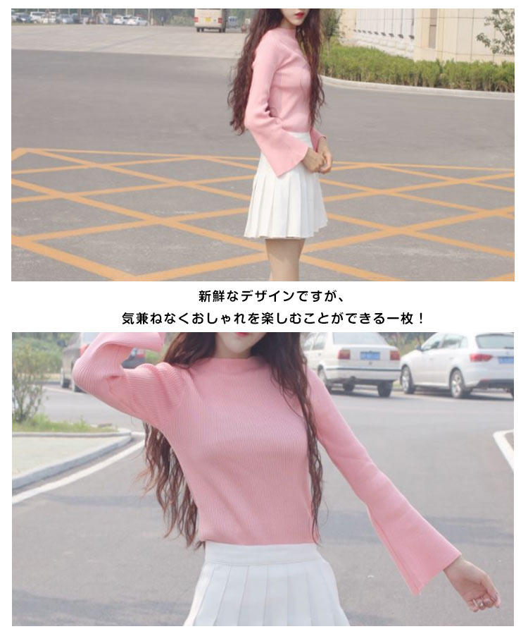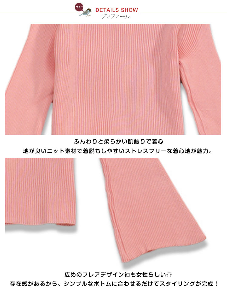 | 品よく女性らしい雰囲気を魅せるフレア袖ニットトップス。編みが密なのでしっかりとした肌触りで、厚すぎず薄すぎない程良いニット素材です。袖口がワイドになった袖フレアが女性らしいポイント!新鮮なデザインですが、気兼ねなくおしゃれを楽しむことができる一枚! | |
