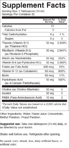 Suggested Use As a dietary supplement One (1) tablespoon (15 ml) daily. - Or as directed by your healthcare professional. Supplement FactsServing Size: 1 Tablespoon (15 ml)Servings Per Container: 32Amount Per Serving% Daily Value***Calories15Calories from Fat0Total Carbohydrate4 gSugars3 gThiamin (Vitamin B-1 As Thiamine HCl)50 mgRiboflavin (As Riboflavin-5-Phosphate)50 mgNiacin (As Niacinamide)50 mgVitamin B6 (As Pyroxidine HCl)50 mgFolate (As Folic Acid)400 mcgVitamin B12 (As Cobalamin)50 mcgbiotin50 mcgPantothenic Acid (As D-Calcium Pantothenate)50 mgCholine (As Choline Bitartrate)50 mgInositol50 mgPABA (Para-Aminobenzoic Acid)10 mgx ***Percent Daily Values are based on a 2,000 calorie diet