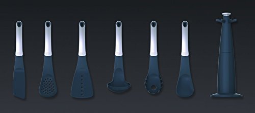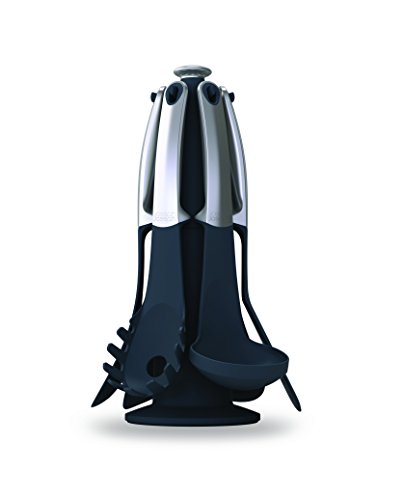 -. Feature : 6-piece set plus storage carousel includes a spaghetti server, slotted spoon, ladle, slotted turner, solid spoon and flexible turner / Tools are heat-resistant up to 392-Degree F; ideal for use with nonstick cookware and bakeware / Patented steel weighted handles elevate heads above counter surfaces to eliminate messes and improve hygiene