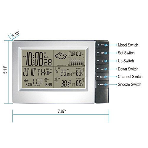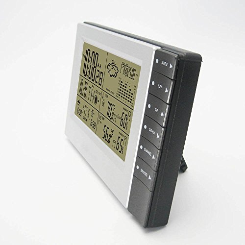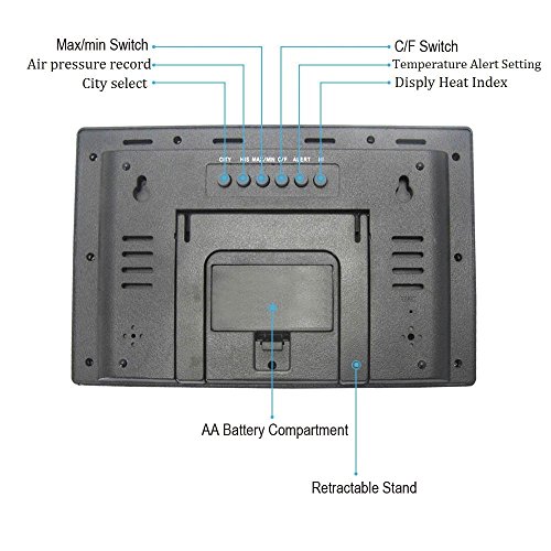 -. Feature : The outdoor sensor displays the temperature and humidity. And wirelessly transmits the temperature and humidity levels to the indoor main unit.MIN/MAX records of IN/OUT Temperature & Humidity / WWVB self setting time and date with automatic daylight saving time updates / The weather station's main console displays a wide range of information in an easy-to-read format on a large LCD and can be Wall-mounted or can stand-alone with the built-in stand. / Monitors Temperature, humidity,as well as barometric pressure (both sea-level and measured), and features a pressure history chart to track trends. / Calculates Sunrise/sunset based on selected city name & Moon Phases & Temperature Alert