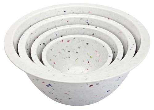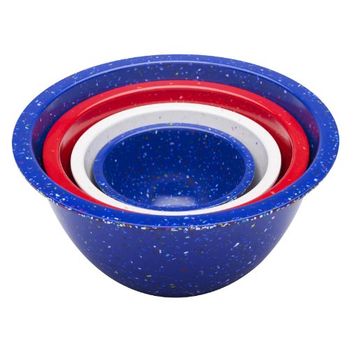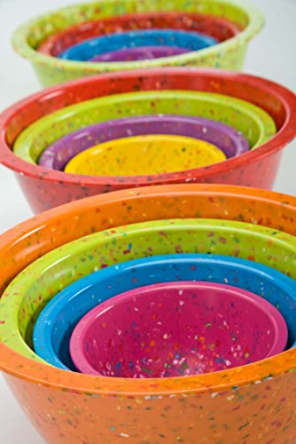 Zak Design's Confetti mixing bowl set has a great retro look inspired by the famous 1950s design and is made from 100-Percent recycled melamine. Melamine has been popular for some time because of its durability and versatility. It can be used indoors and outdoors, is light weight, more resilient to drops and dings than porcelain and ceramic and is dishwasher safe. Zak adds style to the list; these bowls have all the great characteristics of melamine ware plus, with their innovative and fresh design, they make melamine ware become stylish ware. This mixing bowl set feature assorted red-colored bowls with a wonderful and ever-so-fun assortment of colorful "confetti." Because of the material, bowls are not microwave safe. Set includes a 4.4-quart large bowl, a 2.5 quart medium bowl, a 1.25 quart small bowl and an 18-Ounce individual bowl. Perfectly playful – great for parties and barbeques and practical, so you can use them for every day. Zak Designs offers a wide variety of dinnerware and travel ware, products at the forefront of tabletop trends for contemporary and on-the-go lifestyles. Playful, unexpected, spirited, colorful, modern, crisp and clean.Feature