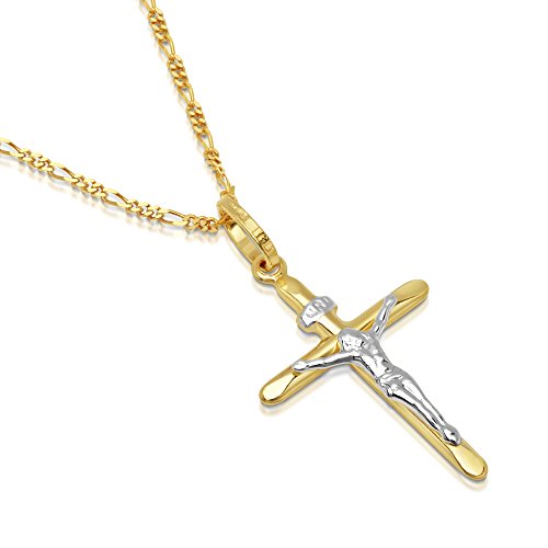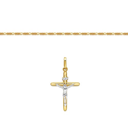 -. Binding : Jewelry -. Brand : DTLA Fine Jewelry -. Department : mens -. Feature : CRAFTED IN SOLID 14K GOLD MADE IN ITALY - This pendant and chain is suitable for Men, Women, Children and made to last. This necklace also comes in a lovely GIFT BOX. / SIZE INFORMATION - The pendant is 26mm heigh and 18mm wide. The included SOLID 14K GOLD Figaro Chain is 1.6mm wide. / OUR 100% SATISFACTION GUARANTEE - You can buy with confidence knowing we will do everything to ensure you are 100% satisfied with your new jewelry. / FAST SERVICE & SUPPORT - Should you need us, we are just an email or phone call away. We respond quickly, and will resolve any issues you may have. / WE ONLY SHIP FROM THE USA - We don't ship from overseas - ever. All our items ship directly from within the United States to ensure they arrive on time and in perfect condition. -. Model : DTLA-PT-0007-CH-0106-P -. MPN : DTLA-PT-0007-CH-0106-P -. PartNumber : DTLA-PT-0007-CH-0106-P -. ProductGroup : Jewelry -. ProductTypeName : FINENECKLACEBRACELETANKLET -. Title : DTLA Solid 14K Gold Figaro Chain Two-Tone Cross Pendant Crucifix Necklace - Choose Length 16" to 22"