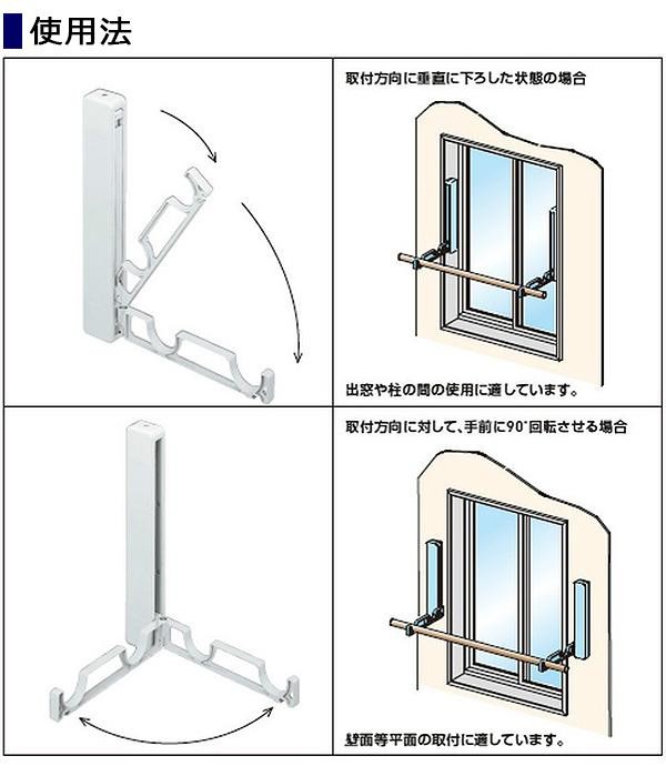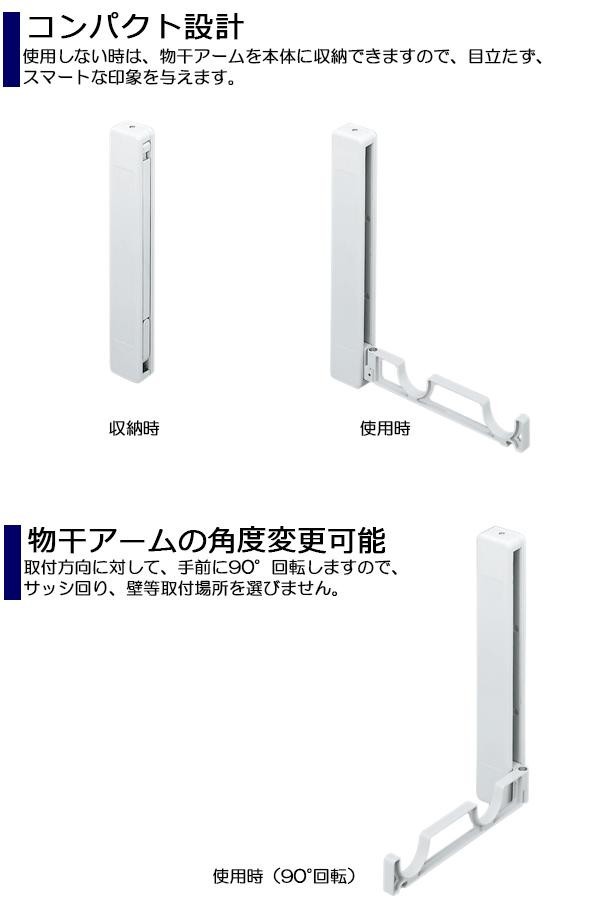 | 使用しない時は、物干アームを本体に収納できますので、目立たず、スマートな印象を与えます。取付方向に対して、手前に90度回転しますので、サッシ回り、壁等取付場所を選びません。取付面には下地が必要です。 |