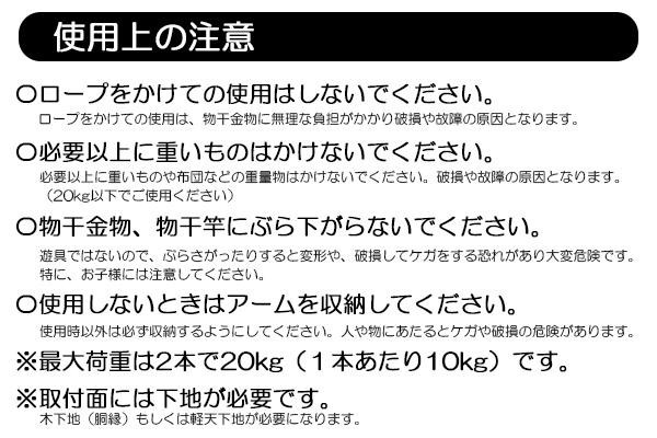 使用しない時は、物干アームを本体に収納できますので、目立たず、スマートな印象を与えます。取付方向に対して、手前に90度回転しますので、サッシ回り、壁等取付場所を選びません。取付面には下地が必要です。 |