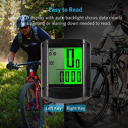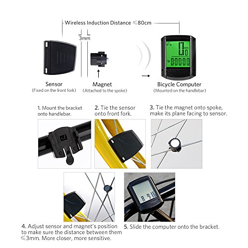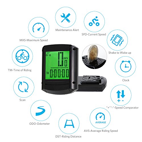 1. SPD:Current Speed 2. ODO:Odometer (Total Distance) 3. DST: Trip Distance(One-Time Mileage) 4. MXS:Maximum Speed 5. AVS:Average Speed 6. TM: Elapsed Time(Riding Time) 7. CLK: Clock (12H/24H) 8. SCAN:- Screen display varies among ODO, DST, MXS, AVS, TM, RPM,CLK every 4 seconds 9. " " "-" - Comparator 10.Setting Speed Scale (km/h, m/h) 11. Set Tyre Circumference(Measure the diameter of wheel, multiply by 3.14, get the perimeter of wheel) 12. The total length of the initial value setting (SETTING TYRE CIRCUMFERENCE) 13. Driving data sampling (FREEZE FRAME MEMORY) 14. Maintenance reminder(MAINTENANCE ALERT) 15. AUTO ON/Sleep Mode(No used it after 5 minutes ,automatically switch to sleep mode)