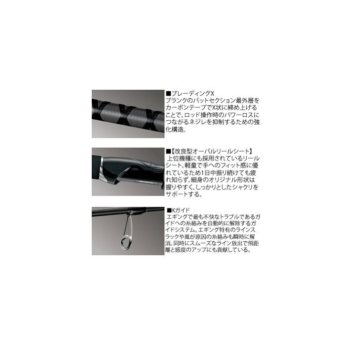 K가이드:에기《구》에 가장 불쾌한 트러블인 가이드에의 사엉킴을 자동적으로 해제하는 가이드 시스템.에기《구》특유의 라인 slack나 바람이 원인의 사엉킴도 순식간에 해소.동시에 부드러운 라인 방출에 비거리와 감도의 업으로도 공헌 하고 있는다.