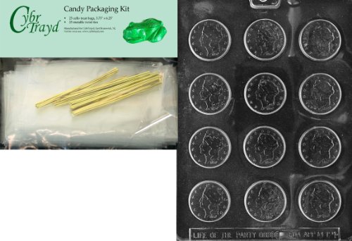 Cybrtrayd Large Coins Miscellaneous Chocolate Candy Mold with Packaging Bundle of 25 Cello Bags, 25 Gold Twist Ties and Chocolate Molding Instructions
