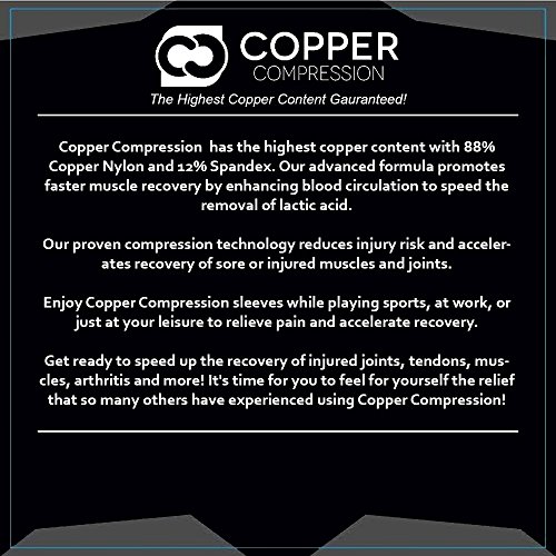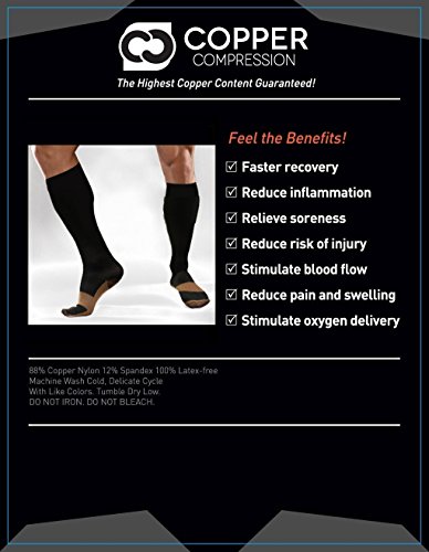 - Feature : Do NOT Be Fooled By Imitations! Many companies claim to have copper infused material but when you turn them inside out you may be disappointed to find that the copper content is very low. We GUARANTEE to have the HIGHEST COPPER CONTENT as well as the HIGHEST QUALITY COPPER in our Copper Compression Knee High Recovery Support Socks! / ACCELERATE RECOVERY & ENHANCE CIRCULATION - Provides mild compression for warmth and helps increase circulation, which ultimately reduces pain and promotes healing. These Copper Compression Knee High Recovery Support Socks also help stimulate oxygen delivery and promote better blood flow to reduce swelling and fatigue, accelerate recovery of injuries, and rejuvenate your feet and legs! / REDUCE STIFFNESS & EASE PAIN - The copper embedded nylon helps stabilize muscle tissue, keeping the swelling of muscle fibers at a micro level and reducing pain. This is a GREAT treatment for plantar fasciitis, achiles tendon, metatarsal, heel pain, as well as other foot and lower leg pains! / WEAR EVERYDAY + HIGH PERFORMANCE - Copper Compression Knee High Recovery Support Socks are extremely comfortable and can be worn everyday to help you recover faster, reduce pain, and get the support you need! Our high quality copper fabric will also withstand washing and will not lose its function over the course of time like many other socks! / GOODBYE SMELLY & UGLY FEET - Our Copper Compression socks help get rid of smelly feet! And they restore skin cells for healthier looking skin! Plus you get a 100% MONEY BACK GUARANTEE: If you are not COMPLETELY satisfied for any reason at all, you can easily get a fast, prompt refund. So you get to try them out completely RISK FREE!