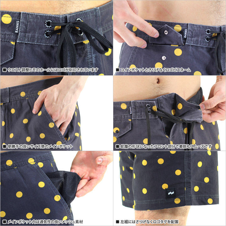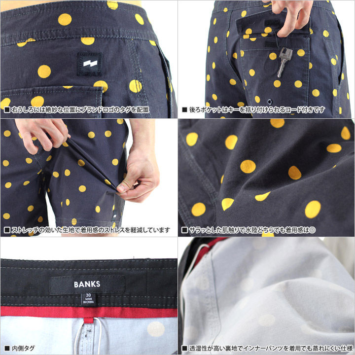 少しワイドめなクラシックなシルエットと程良くストレッチが効いた生地で着用感のストレスを軽減。思わず目線が集中してしまうオリジナルのドット柄で大人サーフコーディネートのハズシアイテムとしてオススメのアイテムです。